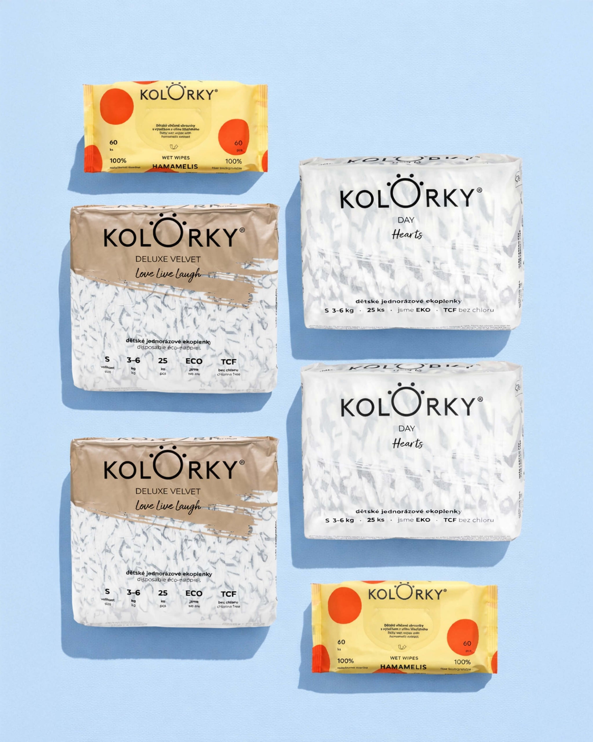 4 balíčky plienok a 2 balíčky vlhčených obrúskov, aby bolo dosť času vyskúšať ich v bežnej prevádzke – doma, na cestách aj v noci.